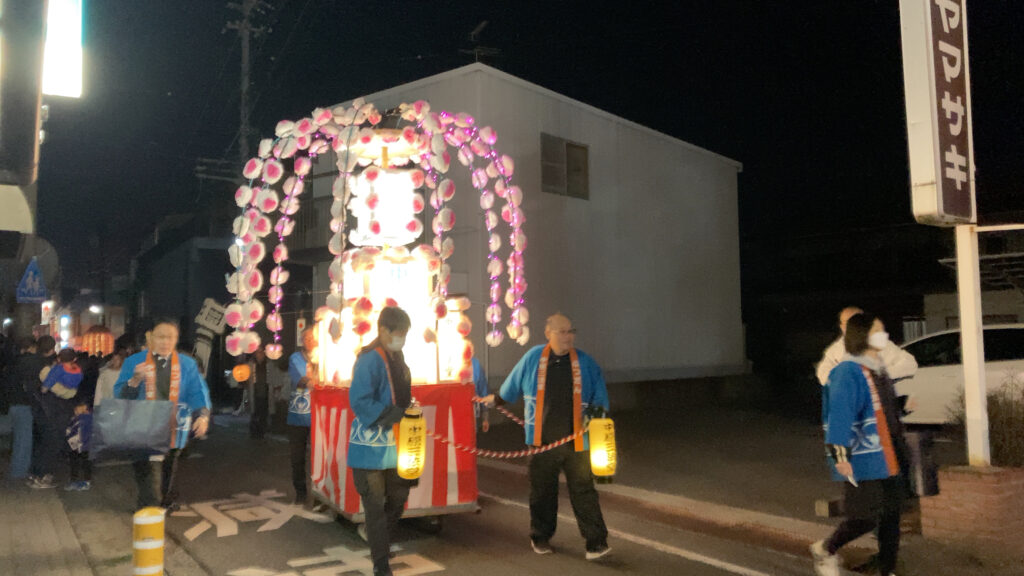 JAを出発した行列は、消防車、地域の子どもたちや地域の皆さん、地元の会社、万灯講の順番で、大寺の本堂前を目指して進みました。
