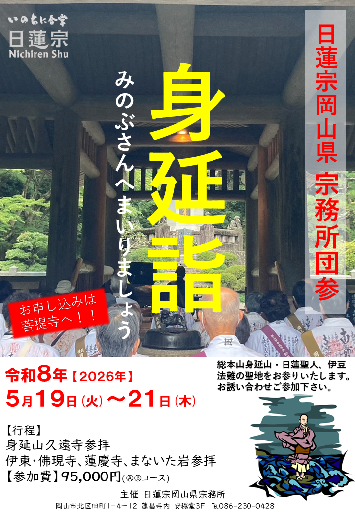 来年(2026年)5月19日(火)〜21日(木)、岡山県宗務所主催による身延山久遠寺参拝を計画しております。岡山県内の檀信徒の皆さまとともに参拝し、現地にて輪番奉仕を行う予定です。