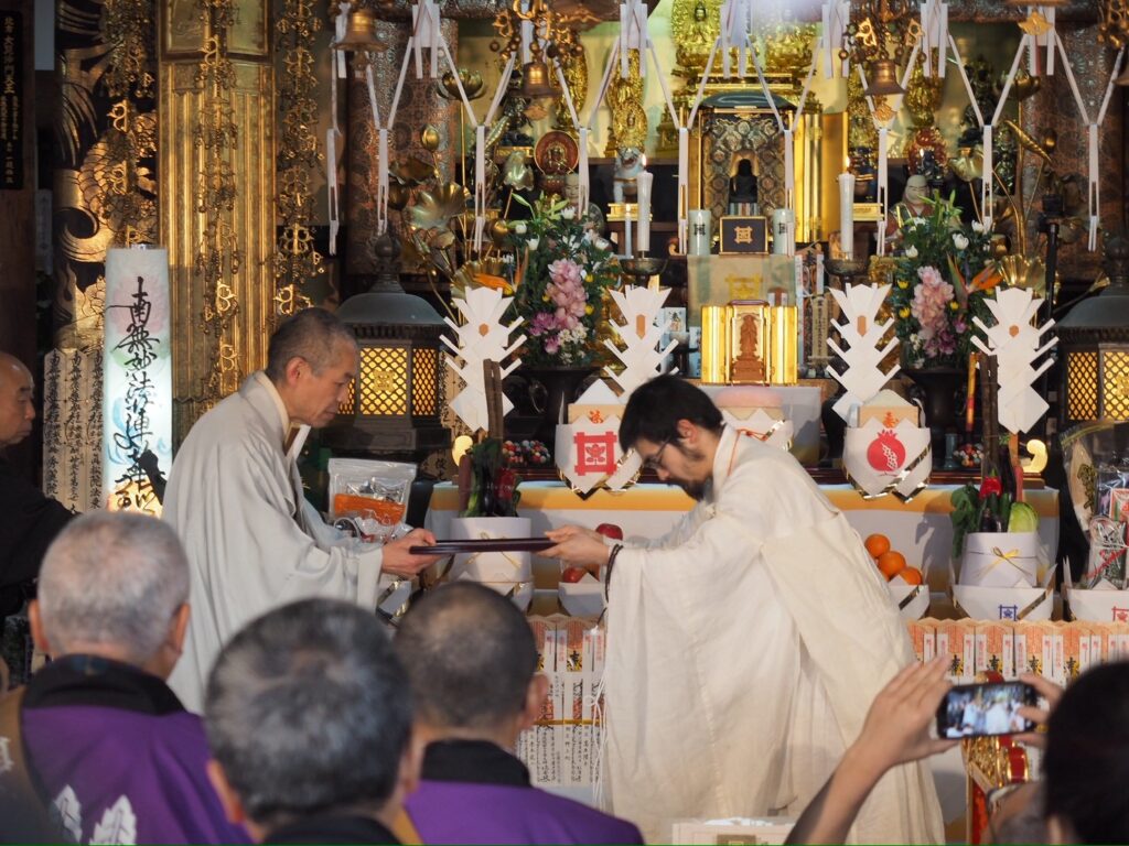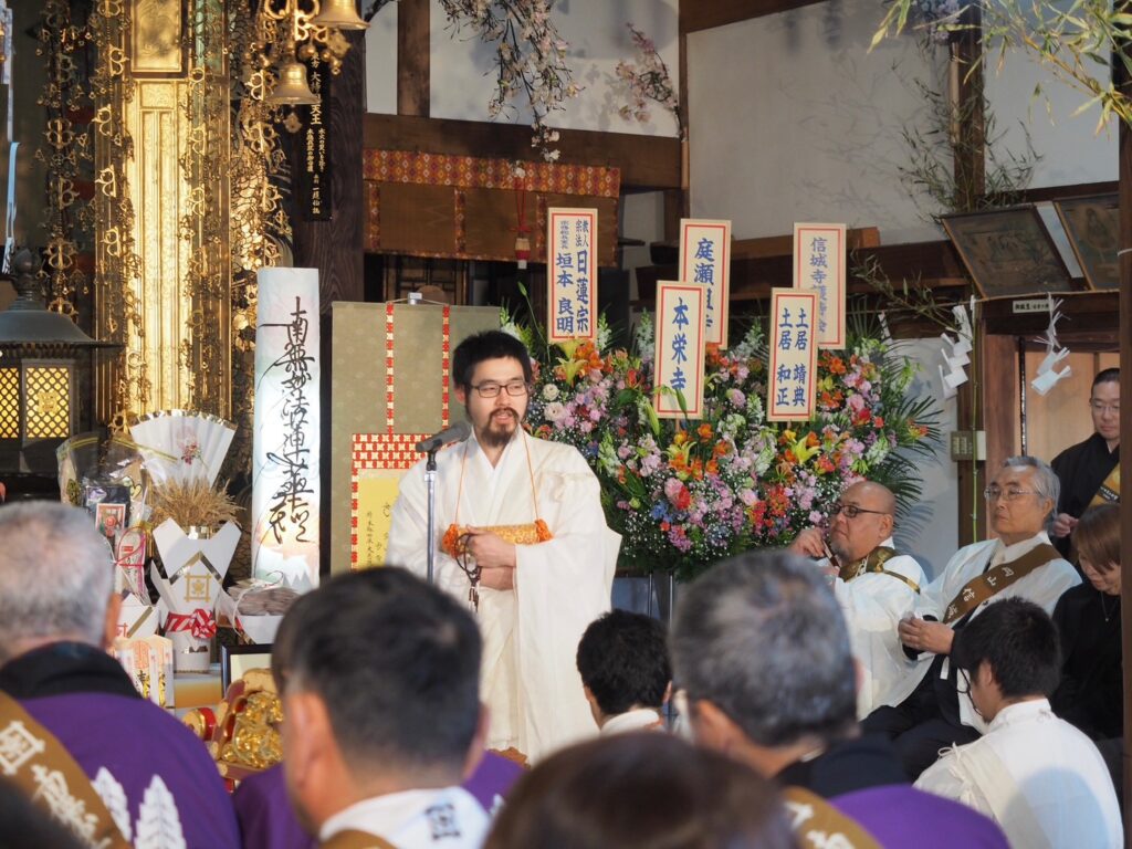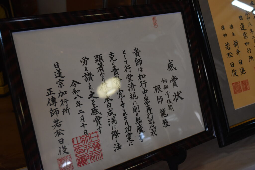 式典では、御本尊様への帰山奉告ならびに檀信徒各位への御祈祷が厳修されましたが、とりわけ印象深かったのは、昨年ご遷化された祖父であり前住職へのご回向であります。お姿こそこの世にはあられませんが、その御加護とお導きが成満への大きな力となったことは疑いありません。
