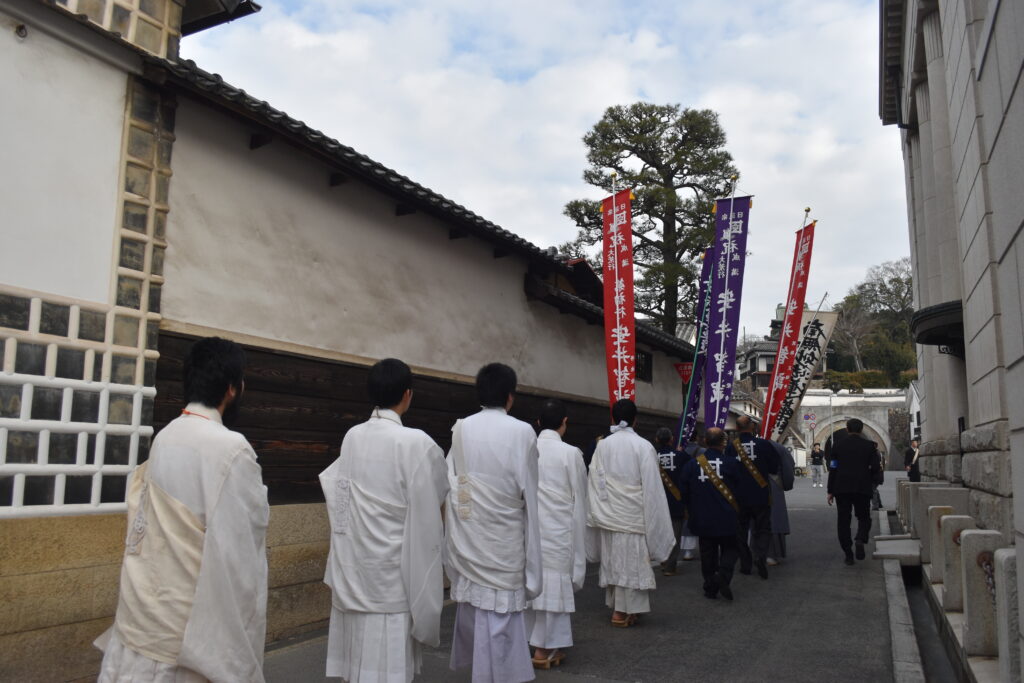 当日は、情緒あふれる倉敷美観地区を練り歩く帰山行列が華やかに繰り広げられました。成満旗が冬空にはためき、荒行僧、県内有縁の僧侶各聖、そして大勢の檀信徒が列をなして進む荘厳な姿は、歴史ある町並みにひときわ映え、居合わせた観光客の方々も足を止め、興味深く見守っておられたことでしょう。