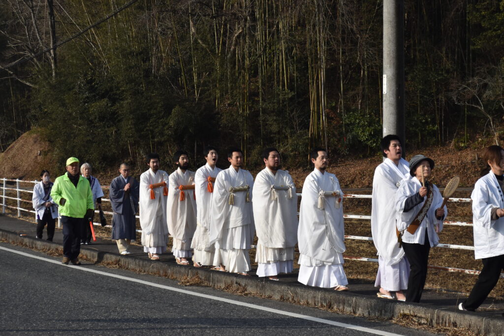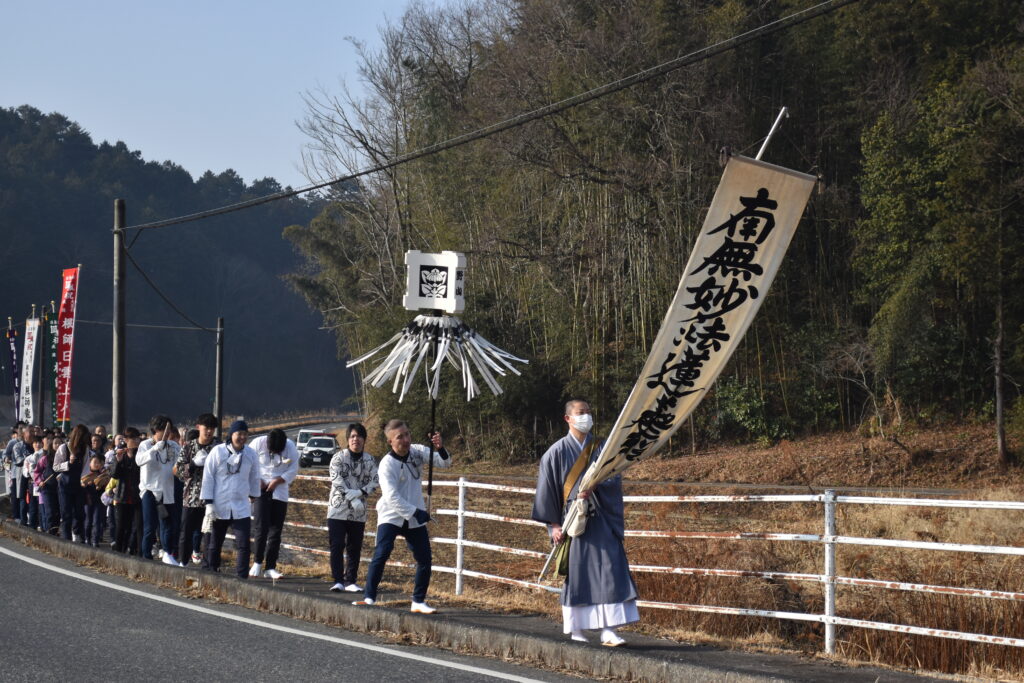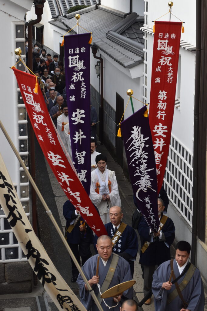 庭瀬地域には日蓮宗寺院が多く、お題目の信仰が古くより根づき、法華の教えが深く染みわたっている土地柄であります。その地域において、百日荒行を成満した荒行僧が成満旗を掲げて練り歩く姿は、伝統を知る方々にとっても、どこか新鮮で力強く映ったのではないでしょうか。冬空の下、堂々と進む帰山行列は、地域の信仰心にあらためて灯をともすような光景でありました。