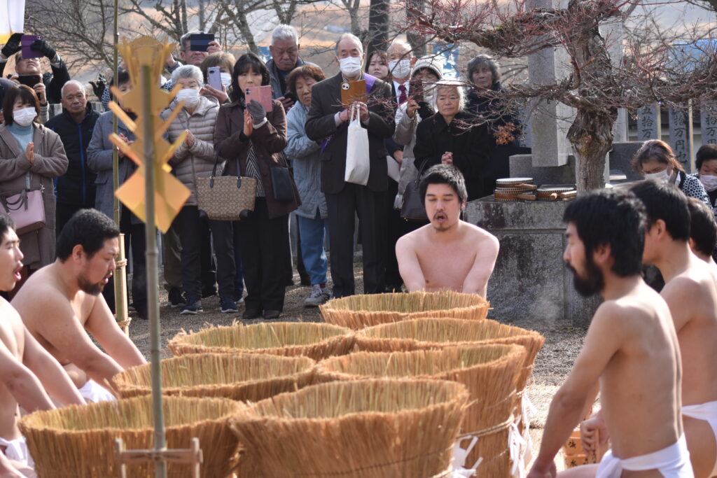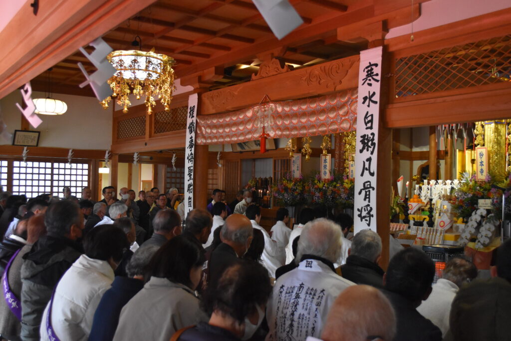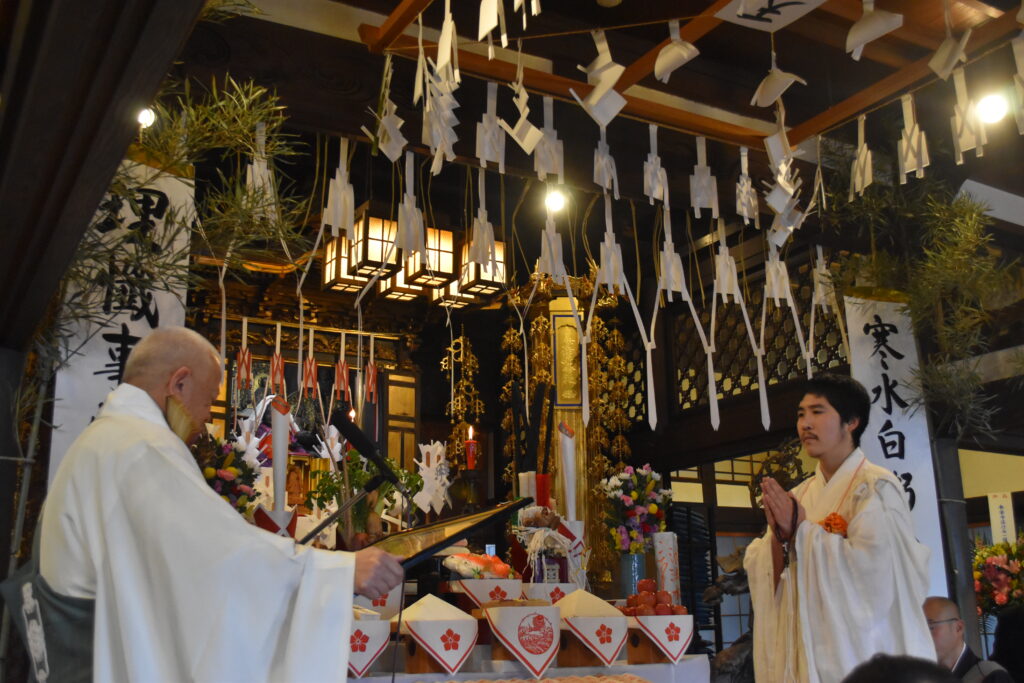 水行式においては、本人はこれまで学寮等で水行の経験を積まれてこられたとはいえ、百日間の荒行という極限の環境下で重ねた水行は、まさに心身を徹底的に鍛え上げるものであったに違いありません。冷たい法水を堂々と身に受けるそのお姿は、自信と覚悟に満ち、成満の証を雄弁に物語っておりました。