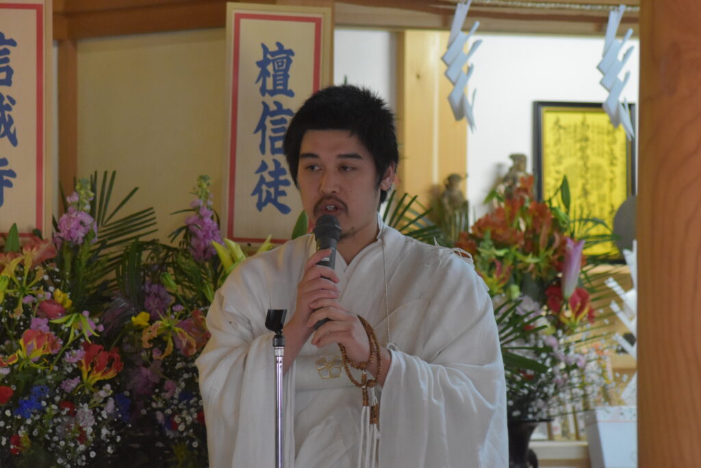 あわせてご挨拶に立たれた智晃上人からは、帰りを待ち続けたお嫁様への温かな気遣いのお言葉があり、会場は和やかな空気に包まれました。また、日頃あまり言葉にして称賛されることの少ない智晃上人が、智誠上人の成満を心から嘉祥されつつも、更なる精進を促されるご指導をなさったことは、師弟の深い絆を感じさせる場面でありました。